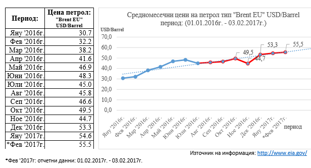През изминалата 2016г., 99.9% от природния газ, потребен от клиенти на “Булгаргаз” ЕАД е от внос и 0.1% от местен добив. Цената на природния газ от внос се влияе от цените на петрола и алтернативните на природния газ горива на международните пазари и курса на долара. В периода 01 януари 2016 г. до 03 февруари 2017г. се отчита ежемесечно повишение на цената на петрол тип “Брент EU/барел”, като същата достига стойности от $55.53/барел през първата седмица на месец февруари 2017г., когато Булгаргаз ЕАД представи прогнозата за цената на природния газ. Цената на петрол тип “Брент EU/барел” през месец февруари 2017г. бележи повишение от 80.8% спрямо началото на 2016г. Цената на природния газ се формира на база средно месечното движение на цените на алтернативните на природния газ горива за период от 9 месеца, които са пряко свързани с цената на петрола. Отчетените по-ниски цени на петрола през месец ноември 2016г. от $44.7/барел са недостатъчни да повлияят върху цената на природния газ.