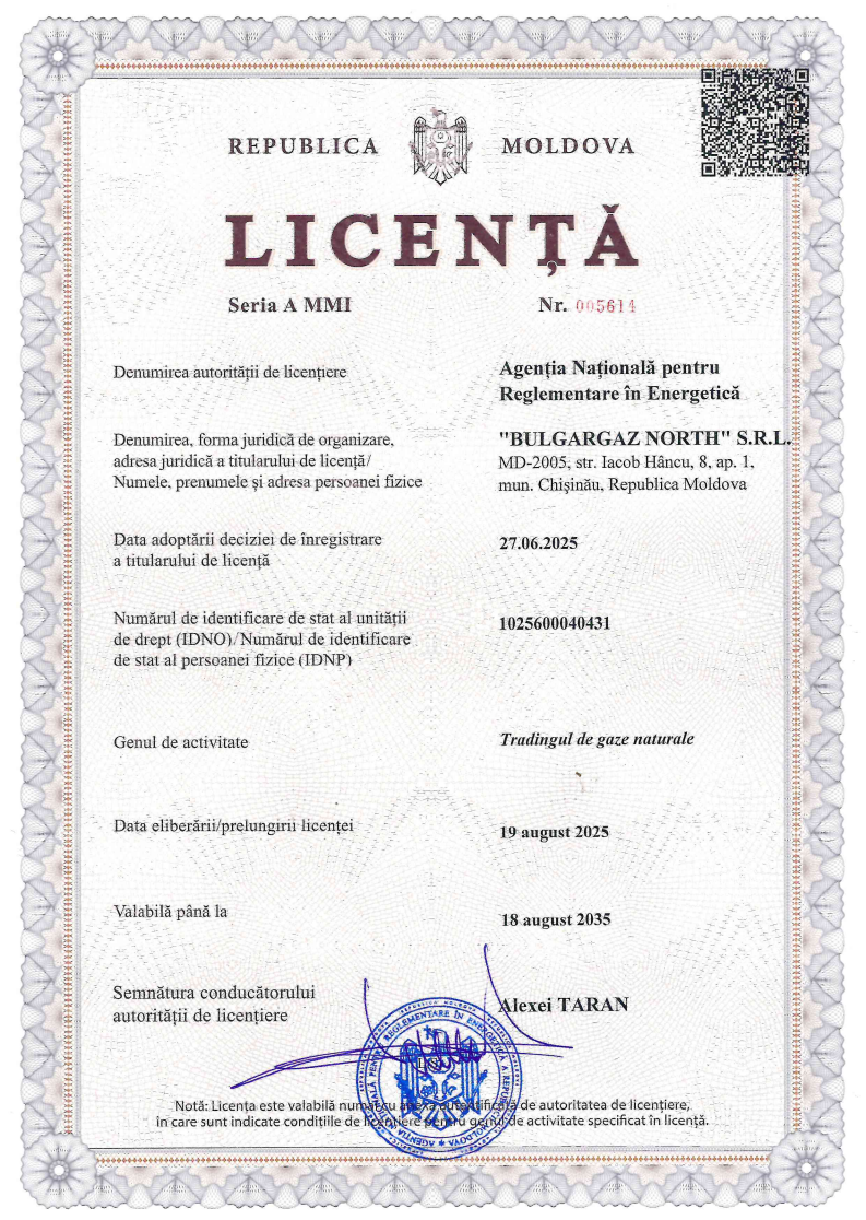 На основание чл. 21, ал. 1, т. 1 и във връзка с чл. 39, ал. 1, т. 5, предложение второ от Закона за енергетиката, с решение на Комисия за енергийно и водно регулиране (КЕВР) от 16.09.2021 г. / № Л-548-15 „Булгаргаз” ЕАД придоби лицензия за търговия с природен газ / № А0435 за срок от 10 години.